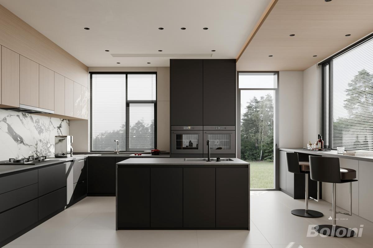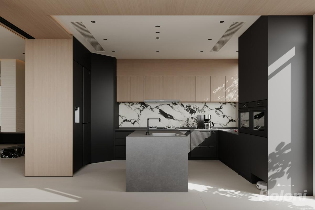 厨房以暖木色与黑灰撞色,大理石纹背板衬出高级感,极简柜面配隐形拉手显利落。中岛台兼作操作与社交区,嵌入式厨电 + 金属吧椅点缀精致,大窗引自然景,灯光层次柔化冷调,在实用与美学间平衡,尽显低调奢华的现代厨居格调。