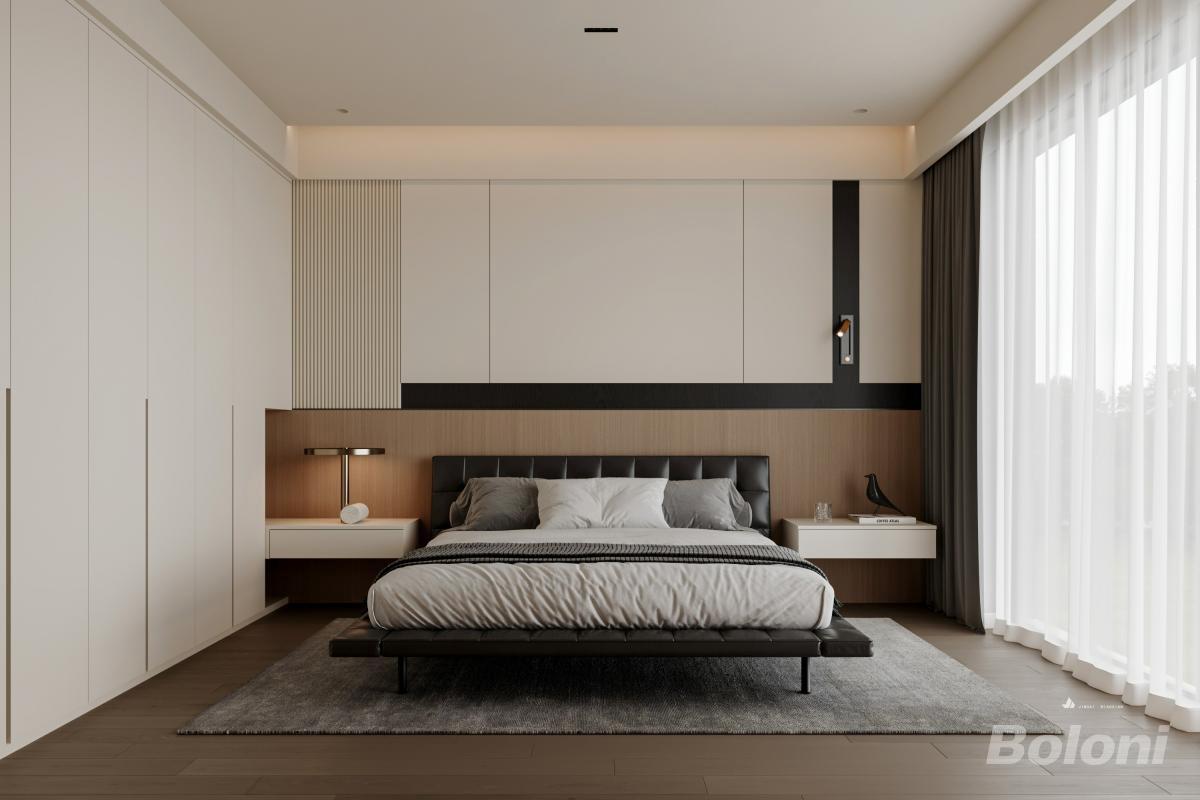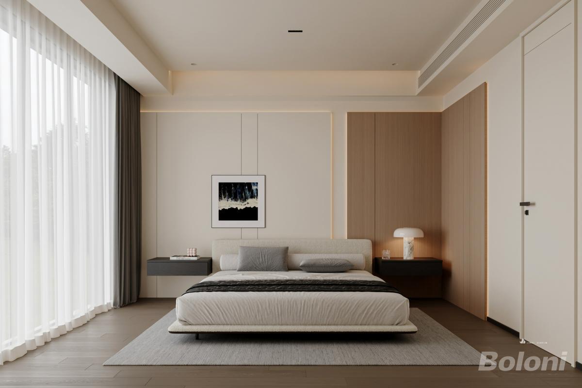 卧室以暖白为基底,搭配木饰面与暗藏灯槽柔化氛围。浅调床品叠搭黑纹装饰,极简边柜配艺术台灯,抽象挂画点睛精致感,通透纱帘引自然光,在简约线条与材质层次中,既保寝居松弛感,又以细节透出低调高级的轻奢格调。