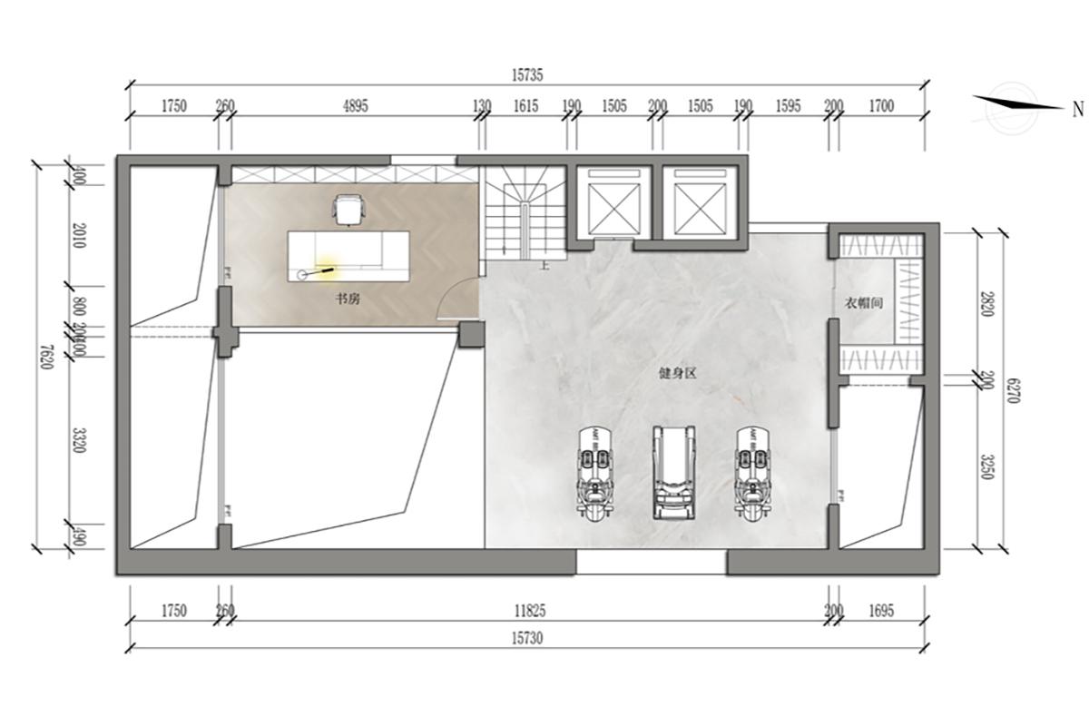 该空间以轻奢为基调,分区明确:书房适配办公阅读,健身区承载运动需求,衣帽间兼顾收纳。动线流畅且功能独立,利用通透布局弱化边界,搭配精致软装可呼应轻奢质感,既满足办公、运动的多元需求,又在实用布局中透出高级生活格调。