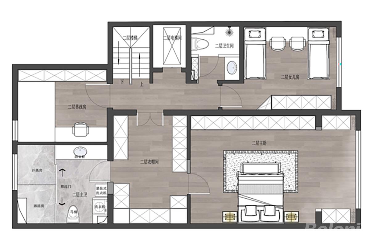 本层以轻奢质感规划,设主卧、儿女房与功能区,动线串联楼梯、卫浴与衣帽间,私密与便捷兼具。主卧配休闲区显松弛,主卫含汗蒸、淋浴强化舒适,木质基底衬出温润高级感,功能分区清晰,营造精致起居场域。