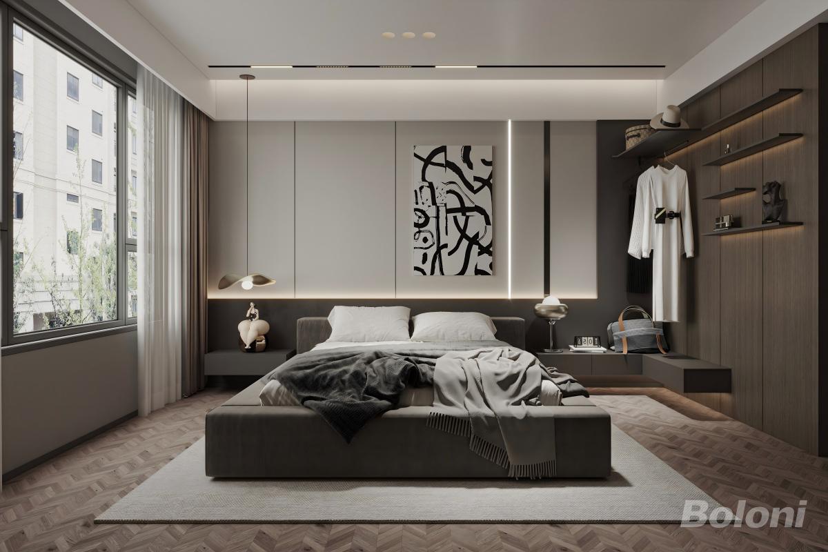 本卧室以灰棕为主调,人字拼地板衬出温润基底,悬浮软包床配金属灯具,显轻奢质感。背景墙暗藏灯带 + 艺术画,开放格架嵌暖光,软装选质感织物,无主灯设计柔化空间,在简约布局中,以细节巧思营造高级松弛的休憩氛围。