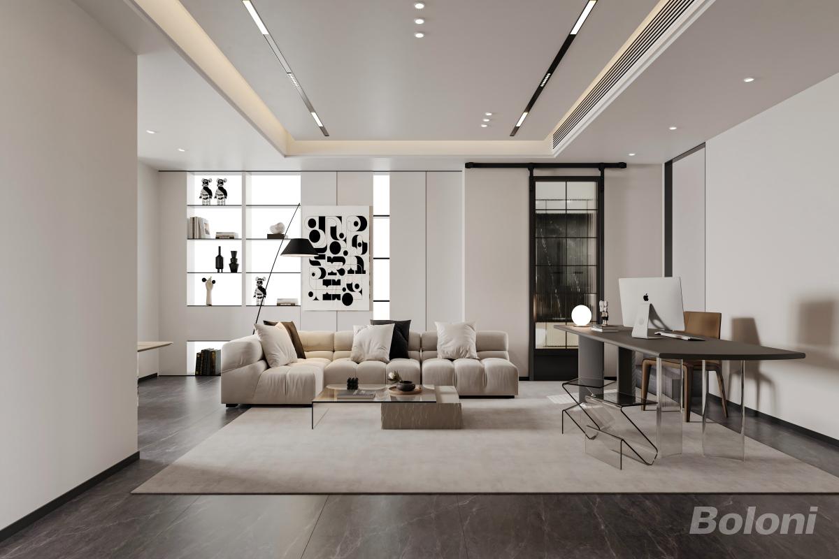 本空间以米白 + 深灰为主调,云朵沙发配玻璃茶几,软质肌理揉入金属线条,显轻奢柔感。开放式格架嵌艺术装饰,玻璃移门透隐式收纳,无主灯 + 悬浮吊顶衬出通透感,在简约布局中,以材质层次与细节巧思,营造高级松弛的轻享氛围。