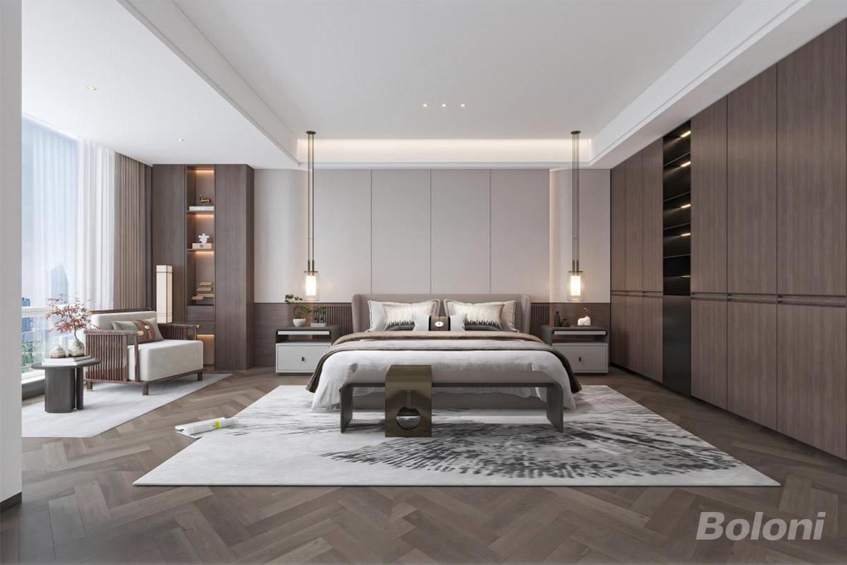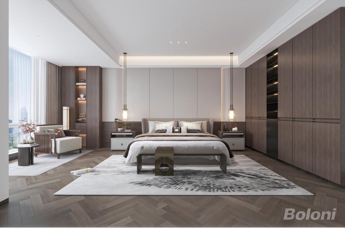 本卧室以暖棕木调为主,人字拼地板搭软包床具,金属线条床尾凳与暗藏灯格架衬出轻奢质感。背景墙柔化线条,搭配水墨纹地毯与简约软装,无主灯 + 悬浮吊顶营造静谧氛围,在舒适松弛中尽显精致高级。