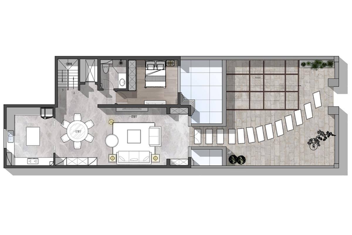 本层空间以轻奢质感布局,串联客厅、餐厅与卧室,动线流畅。室内外衔接休闲区,配弧形座椅与绿植,柔化空间氛围;大理石基底衬出高级感,功能分区清晰,兼顾起居、社交与放松,营造舒适高阶的生活场域。