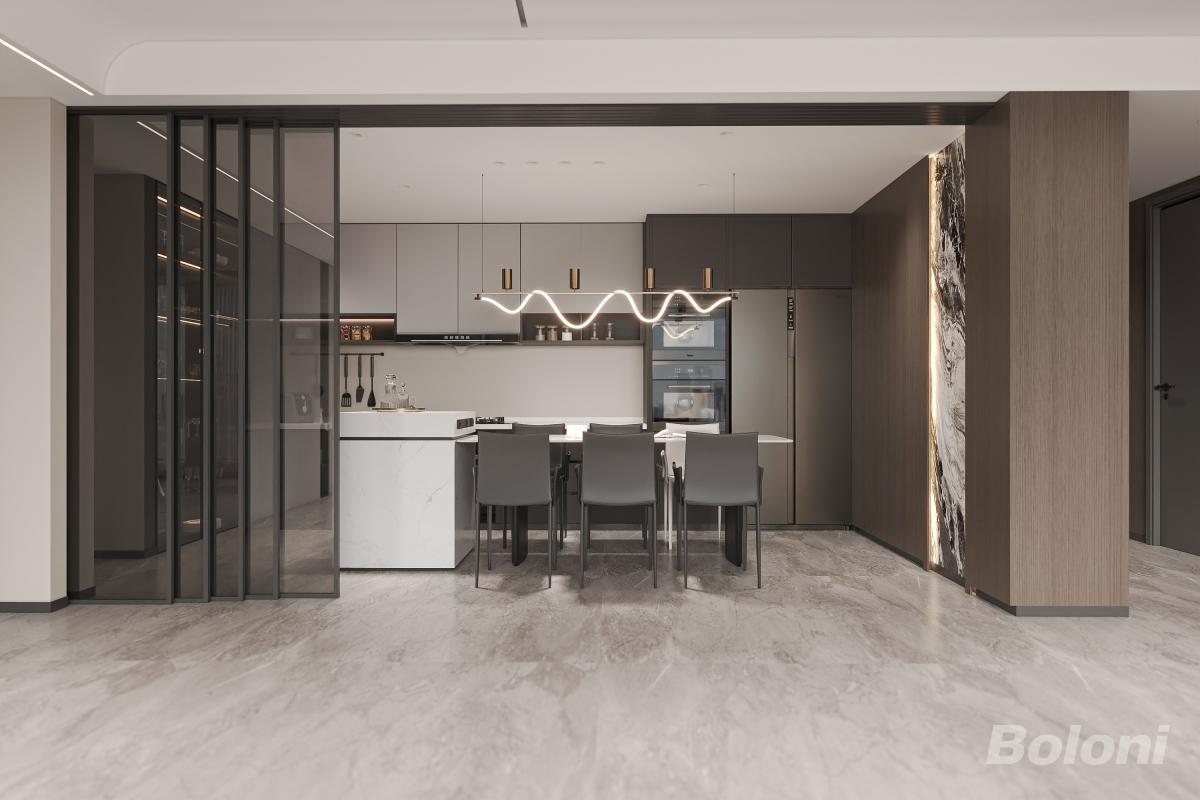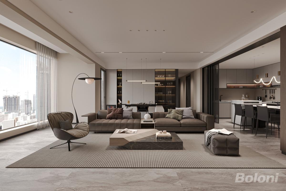 本客餐厨一体空间以低饱和棕灰为主调,皮革沙发、大理石纹茶几搭金属线条,显轻奢质感。玻璃置物柜嵌暖光,无主灯 + 波浪形吊灯添精致;通透格局连厨房,在简约线条与材质细节中,营造高级松弛的生活氛围。