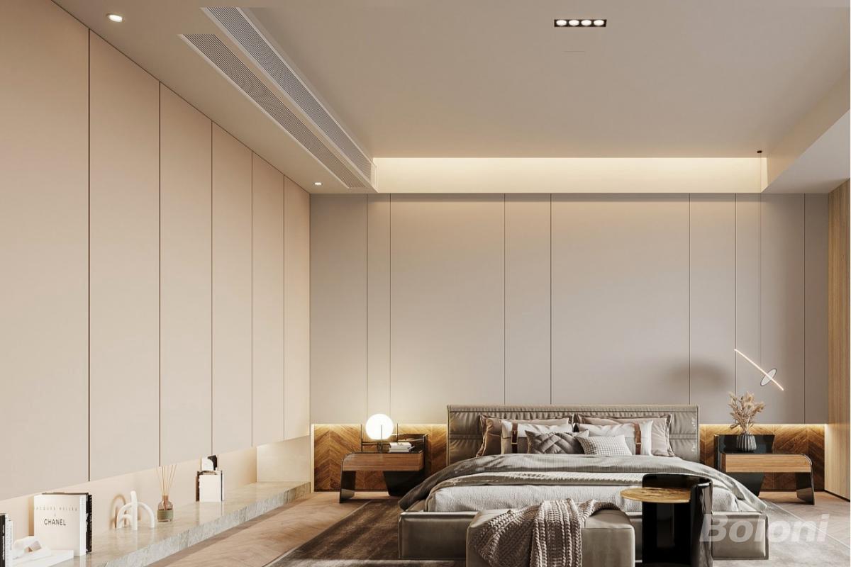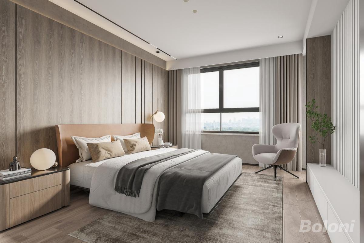 本卧室以木饰面营造温润基底,低饱和色调串联绒面床品与极简家具。大窗引自然光浸润空间,线性灯晕染层次,材质质朴对话间,在秩序感中构建松弛私享的休憩场域 。