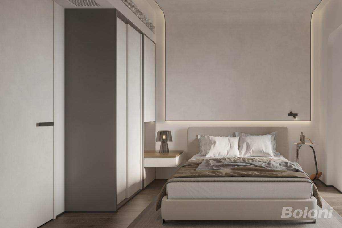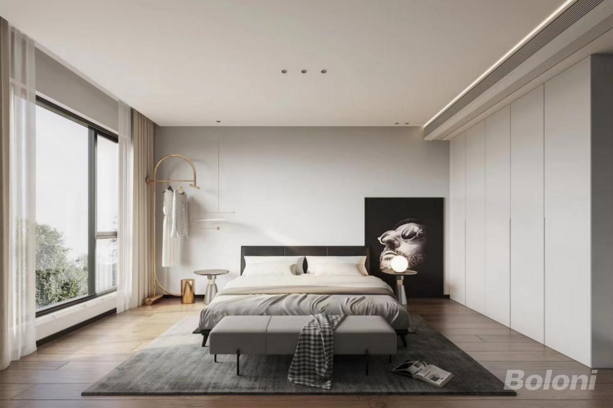本卧室以低饱和灰调筑静谧基底,极简线条串联定制柜体与界面,线性灯晕染床头层次。木色 bedside 台柔化冷调,哑光材质呼应现代质感,于克制秩序中,构建无扰休憩场域 。