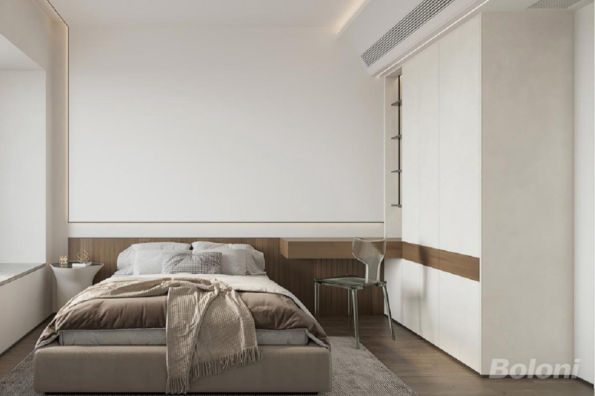 本卧室以低饱和色调构建静谧基底,木饰面与肤感材质碰撞温润层次。线性光带弱化边界,悬浮床头、一体化书桌简化形态,透明座椅添轻盈感。织物与木色呼应,在极简秩序中,编织松弛治愈的休憩场域 。