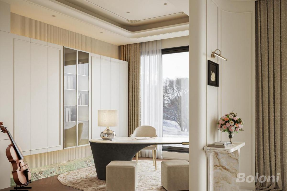 以二楼私密场域为基底,借法式优雅基因重构:对称布局串联休憩与共享区,弧形线、金属饰勾勒精致轮廓,米灰调糅合香槟金,丝绒、大理石互衬。以雕花细节藏浪漫,用温润质感筑静谧,让轻奢格调在私密维度里优雅生长 。