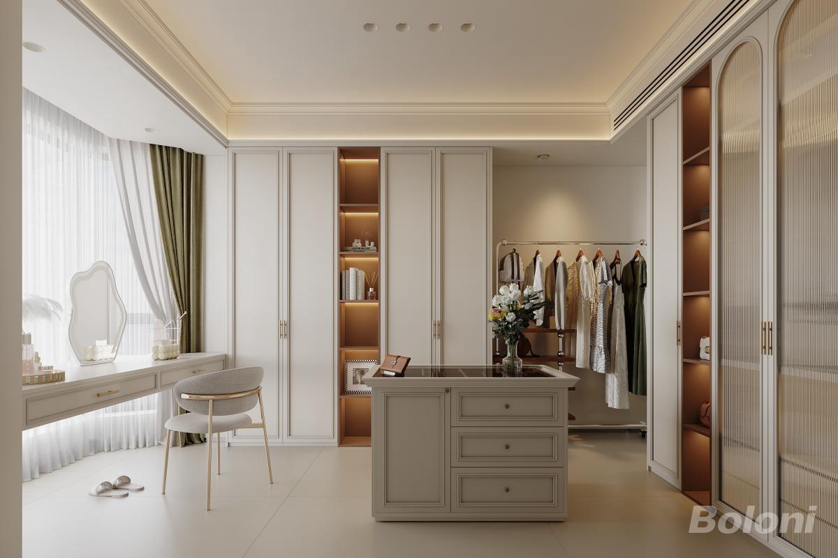 借庭院造景,通厅串联起居与餐厨,构建法式轻奢的优雅场域。以米金、暖棕为基调,融入金属饰边、丝绒肌理,搭配弧形线条与雕花细节 。去繁就简间,让浪漫仪式感与空间通透感交融,诠释轻奢生活的细腻格调 。