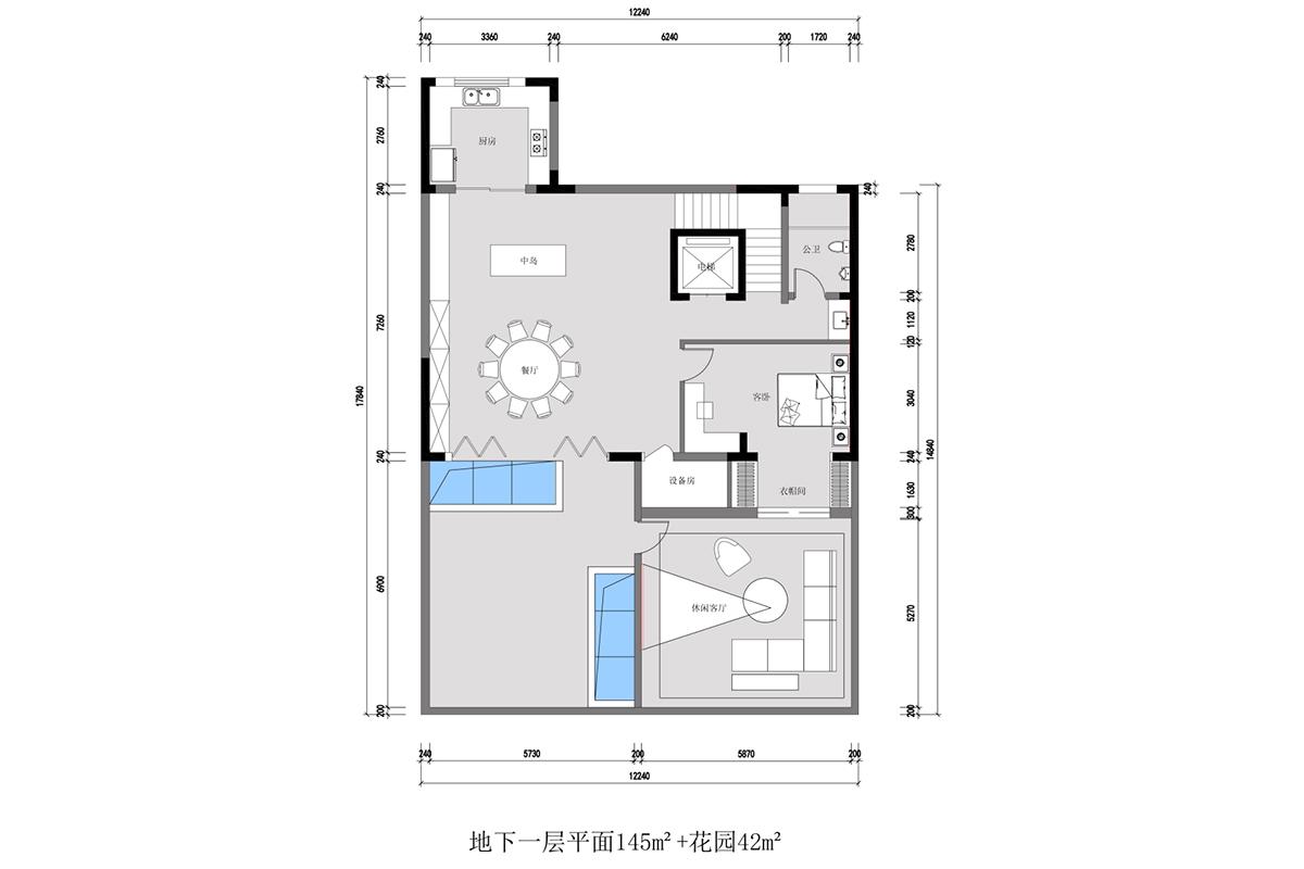 地下一层以法式松弛感重构社交场:42㎡花园引光入室,中岛与圆厅围合对称秩序。休闲区圆弧造景柔化边界,石材肌理衬亚麻布艺显温润。借光影晕染仪式感,让地下空间挣脱沉闷,成为优雅与烟火共生的浪漫容器 。