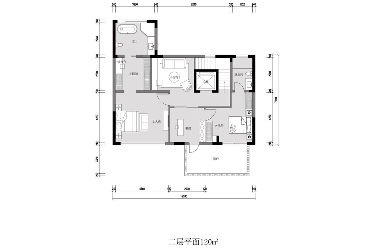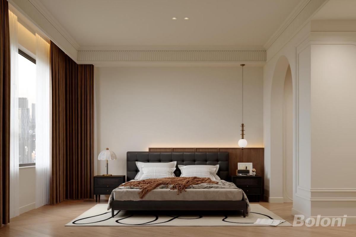 二层作为私密休憩场域,法式美学在此演绎松弛与精致:小客厅围合出社交氛围,圆弧线柔化棱角;主卫与衣帽间串联优雅秩序,胡桃木衬丝绒织物显温润。阳台纳光,卧室以简化石膏线勾勒浪漫,让慵懒与仪式感共生 。
