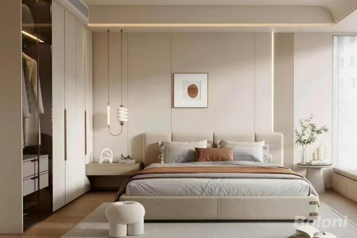 以米杏调为静谧基底,悬浮灯与线性光带勾勒层次。一体化床头糅合哑光布艺,开放式衣柜嵌灯显通透。借简约陈设串联收纳与休憩功能,让材质肌理与光影对话,在克制秩序中,织就松弛的现代睡眠场域 。