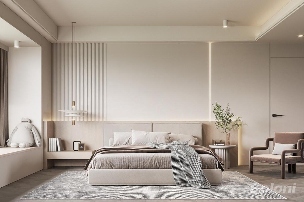 以米灰调为静谧基底,线性光带与竖纹墙板勾勒层次。悬浮床头融合功能美学,简约家具串联场域。借窗引入自然光,人工光柔化边界,让材质肌理与光影共生,在克制秩序中,筑就松弛的现代睡眠私域 。