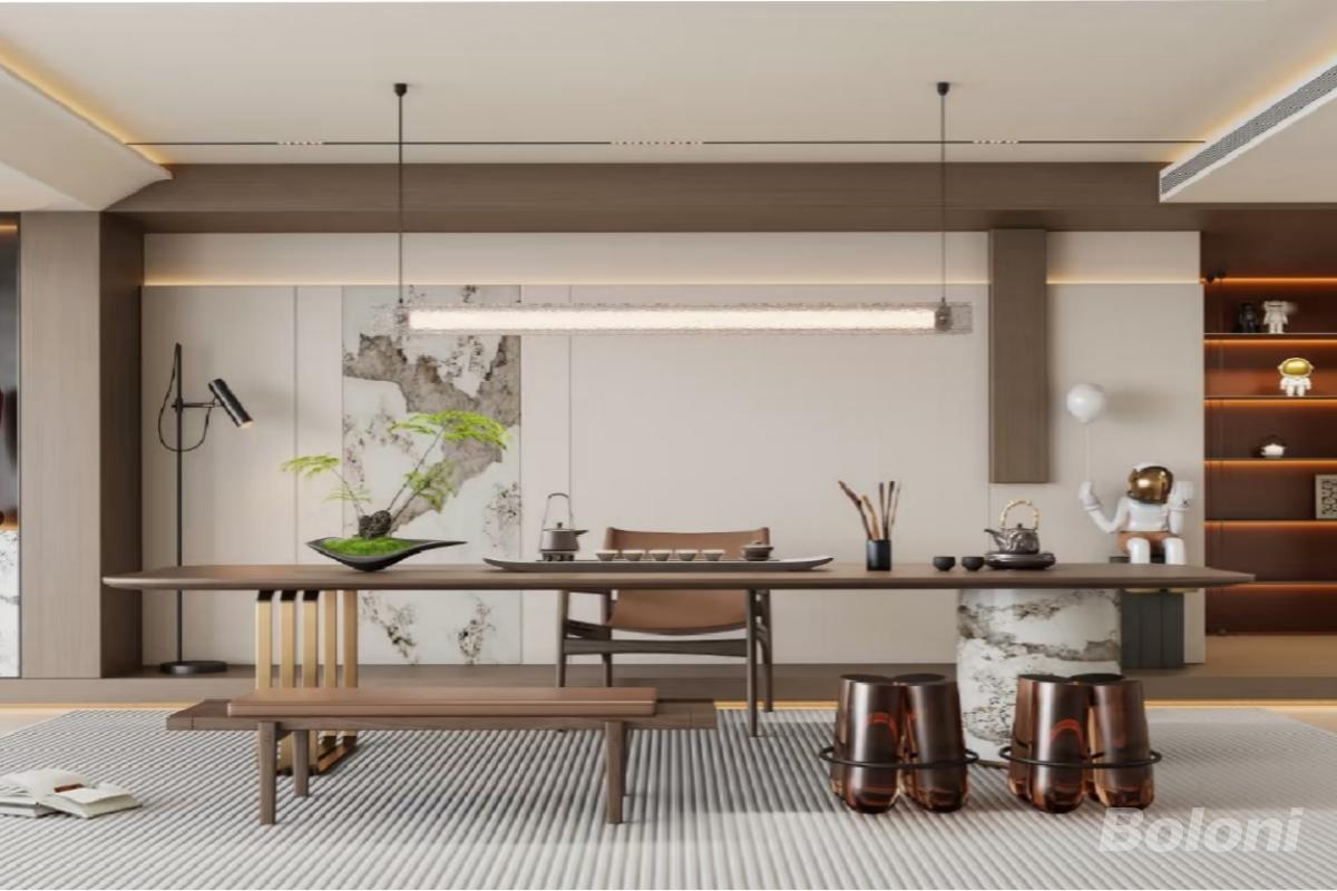以现代语汇诠释东方雅意,原木与石材对话,长桌串联茶事动线。线性灯消弭边界,背景水墨肌理暗合留白,在极简秩序里,让茶叙成为材质、光影与人文的共鸣场域 。