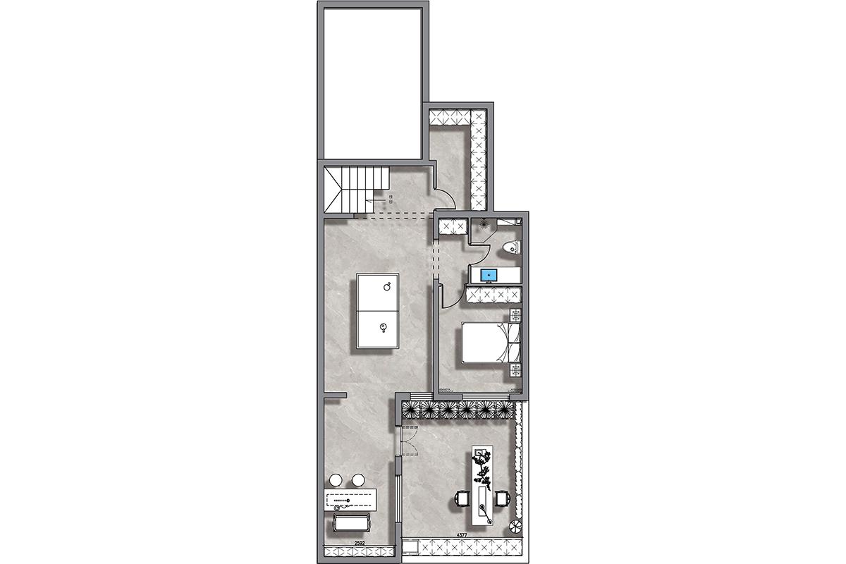 以现代极简逻辑规划休憩层,套房化布局串联睡眠与卫浴功能,动线利落。素色哑光材质打底,线性光带轻描层次,摒弃冗余装饰,让空间在秩序中沉淀静谧,借材质肌理与光影互动,构筑舒适私域 。