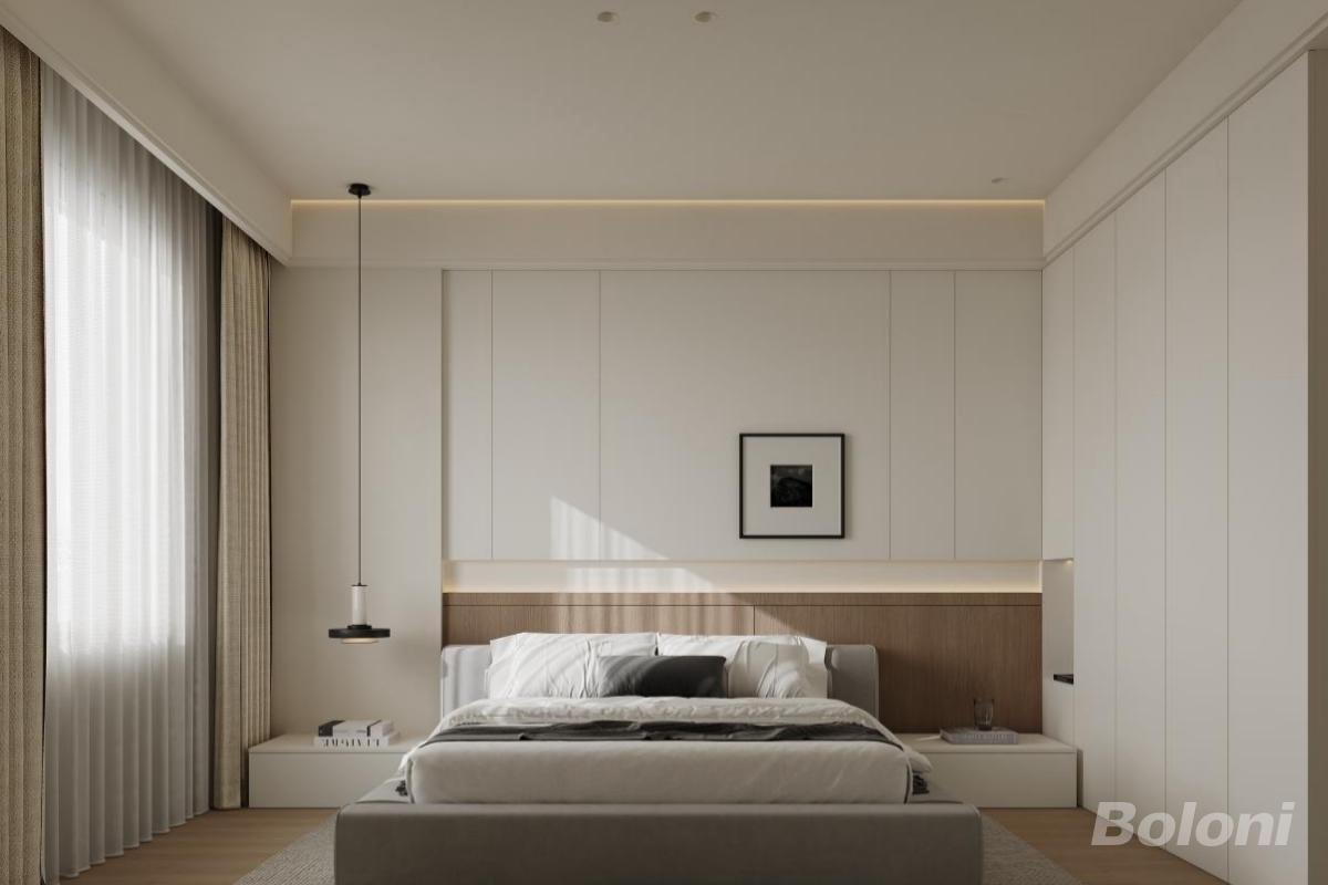 以米白为底,木色作序,串联一体化床头与隐形收纳。点线光源柔化边界,垂坠灯呼应光影层次。借透光帘引入自然,在极简秩序里,筑就去芜存菁的休憩场域 。