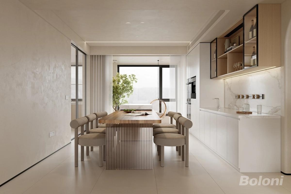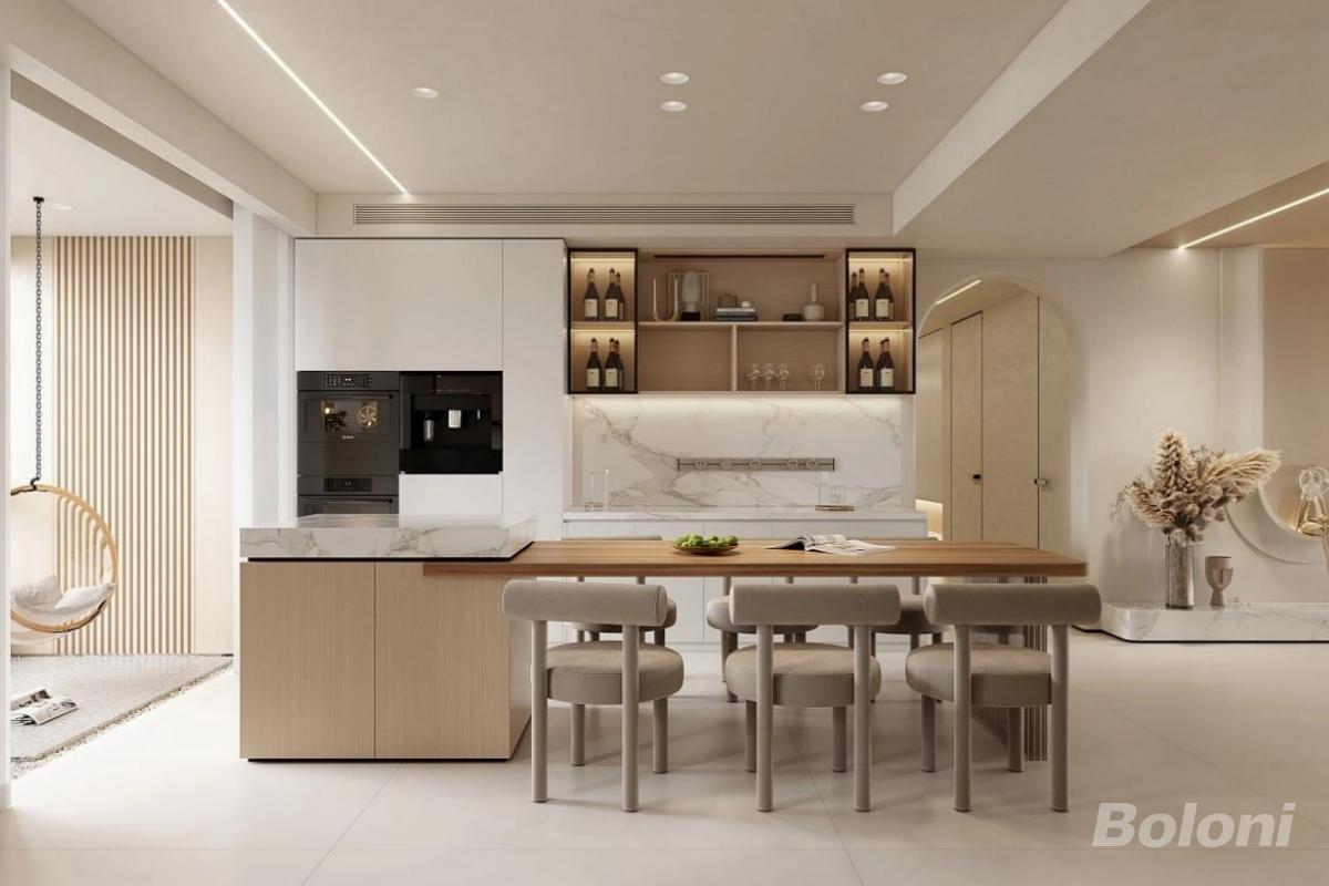 以奶白为底糅合浅木调,用大理石台面衬温润木作,嵌入式家电 + 隐藏收纳消弭杂乱。线性柔光弱化硬朗,圆润椅具适配用餐动线,让餐厨空间裹着暖调松弛感,颜值与实用共融,三餐时光都浸着温柔。