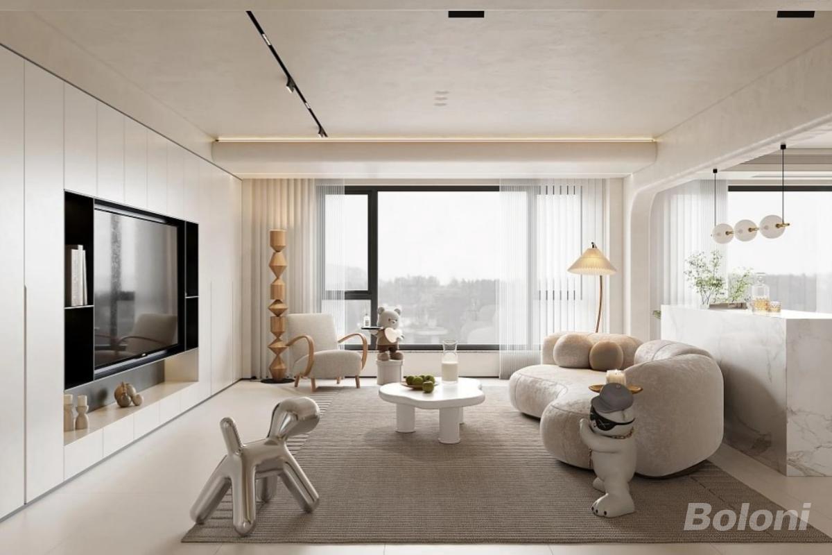 以奶白为基底,去棱角软沙发裹满温润,整面收纳柜消弭杂乱,柔光灯带晕染暖调。浅调软装与潮玩轻缀趣味,让空间在整洁里浸着松弛,日常休憩时,满是温柔裹身的舒适感。
