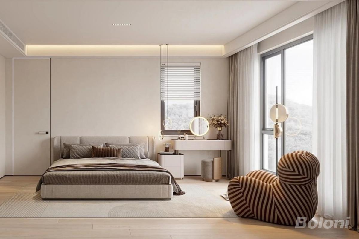 以奶白为底揉入浅木调,柔纱帘、棉麻床品铺陈温润质感,去棱角家具适配休憩动线。嵌入式柔光 + 圆弧镜弱化冷硬,条纹单椅轻缀层次,让每一寸空间裹着松弛暖意,是专属于睡前的疗愈休憩场。