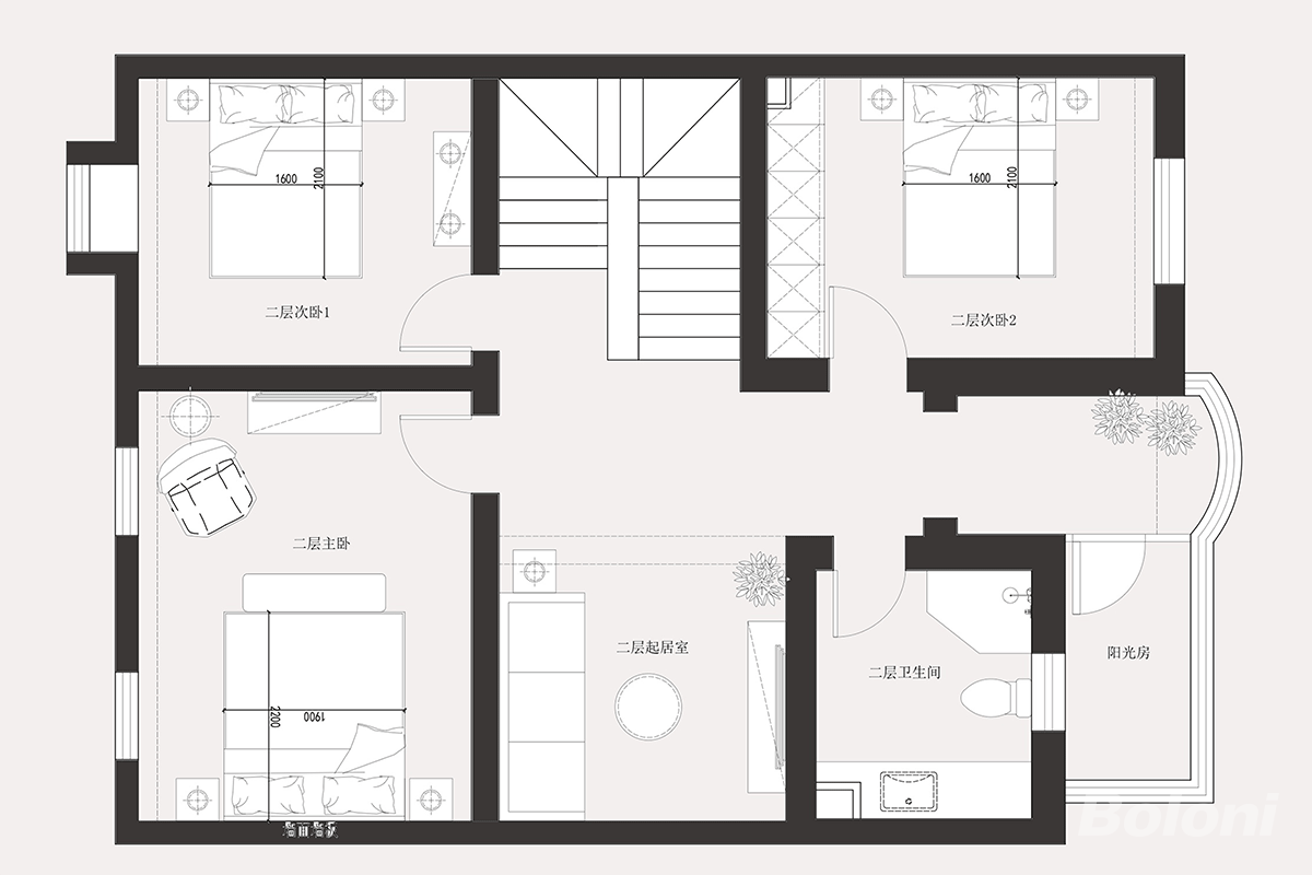 二层主要是居住空间,平时只有老人居住,主卧的储物安排在北侧卧室,释放了主卧空间设置按摩椅满足老人的需求
