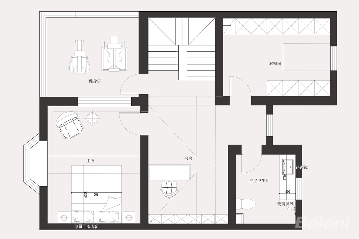 整个三层的空间都是女儿活动区,南侧露台改为健身房,添加了功能区,北侧卧室改为衣帽间增加储物,书房在布局在中间区,除了北侧窗户采光通风,顶上的天窗也是光线补充,使书房光线也比较充足