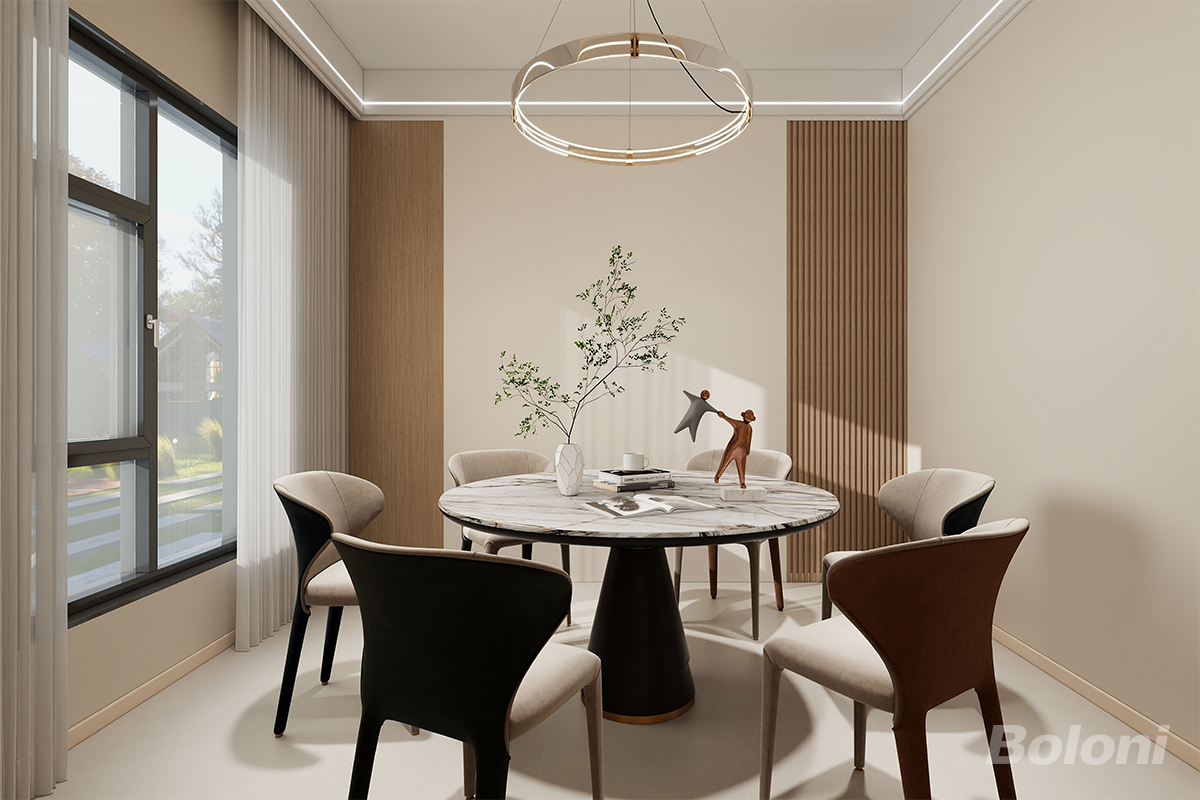 单独就餐区域,是家庭聚会就餐更方便,圆桌的设计也更中式化一些,具有团圆的感觉,简单的背景墙设计,木色部分既体现跳色,竖向设计又实空间视觉上显高。