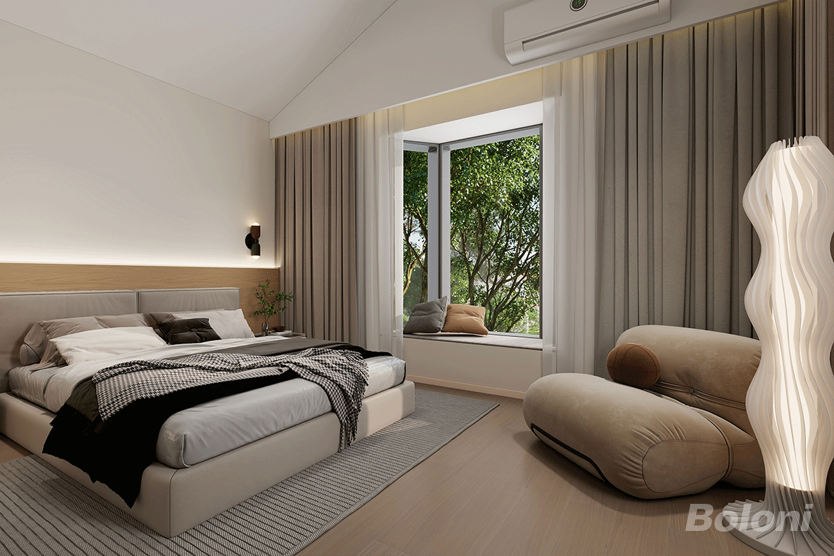 三层主卧保持了原始建筑结构的斜屋顶结构,空间感更好,飘窗以及休闲椅又可以使室内与一楼庭院和三楼露台改造的专属健身区有互动。