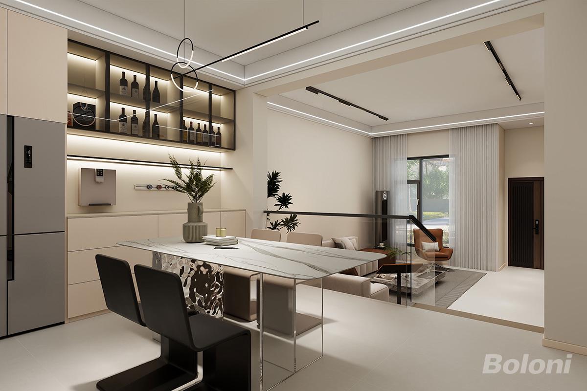 单独设计吧台以及餐边柜区域,既可以满足老人平时人少就餐需求,又为平时小酌或者冲咖啡提供便利,和下沉式客厅也会有一个互动。