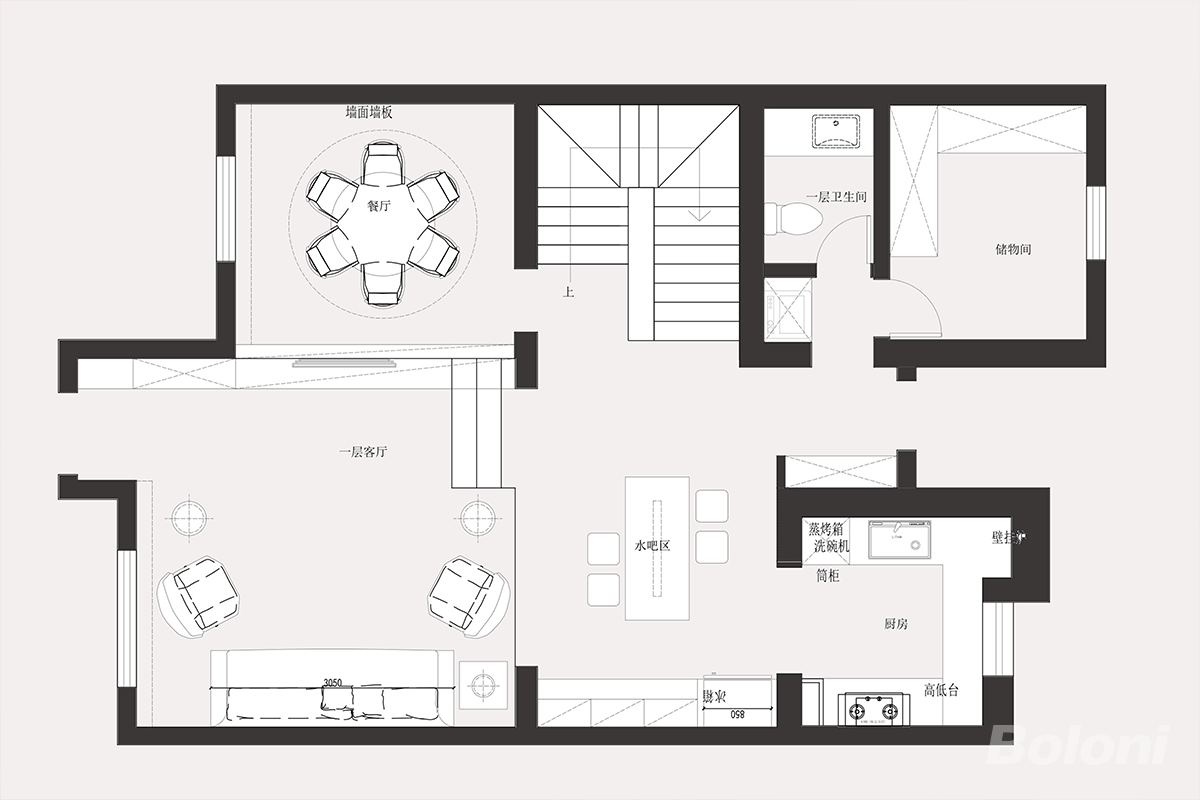 一层布局上拆除了一个卧室空间做餐厅,使各空间打通,使空间视觉上更加有延伸感,采光更好,每个空间的储物也有相应配置完全满足一楼的使用需求