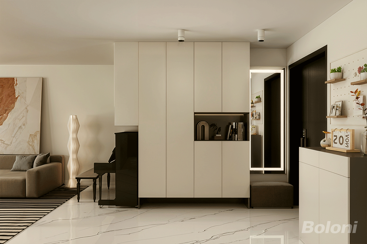 门厅鞋帽柜与钢琴区连接,增加了钢琴墙面的长度,与客厅餐边柜L型设计呼应,补充了入户区的换鞋区穿衣镜以及储物空间