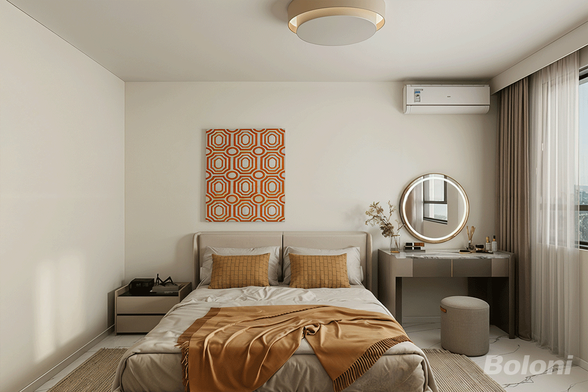 由于床尾整面衣柜比重较大,床头区域以简约为主,颜色以素雅色为主,床品以及装饰画软装的跳色使空间增加变化的同时,也可满足后期可变化性