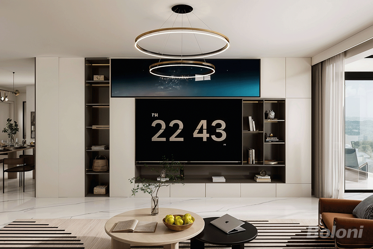 电视背景墙组合式电视柜加投影幕布形式,既能满足储物需求,又增加了多功能性,整体浅色为主,深灰色作为配色,更显高级感