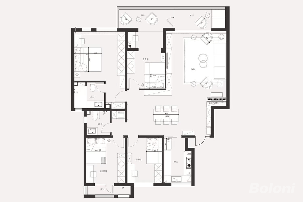 本案整体格局改动不大的情况下满足各个空间功能需求,老人房门洞调整使餐边柜和电视柜结合,也和门厅柜对应,增加整体性,主卫缩小满足基础卫生间需求同时,增加主卧的储物空间