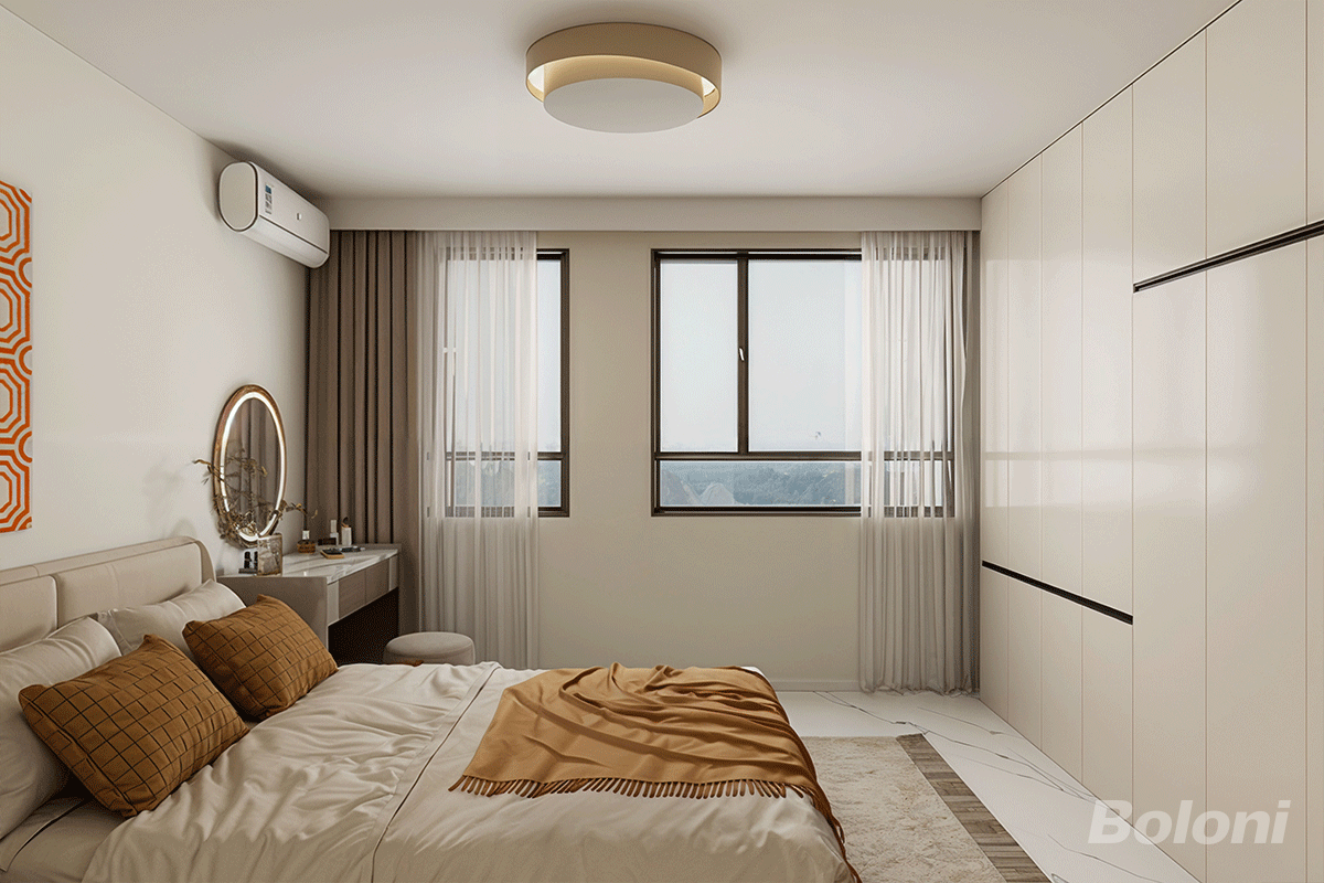 卧室床尾整面衣柜增加了储物空间,衣柜两段式设计深色拉手增加了衣柜的门板的变化,也适门板的稳定性更好。