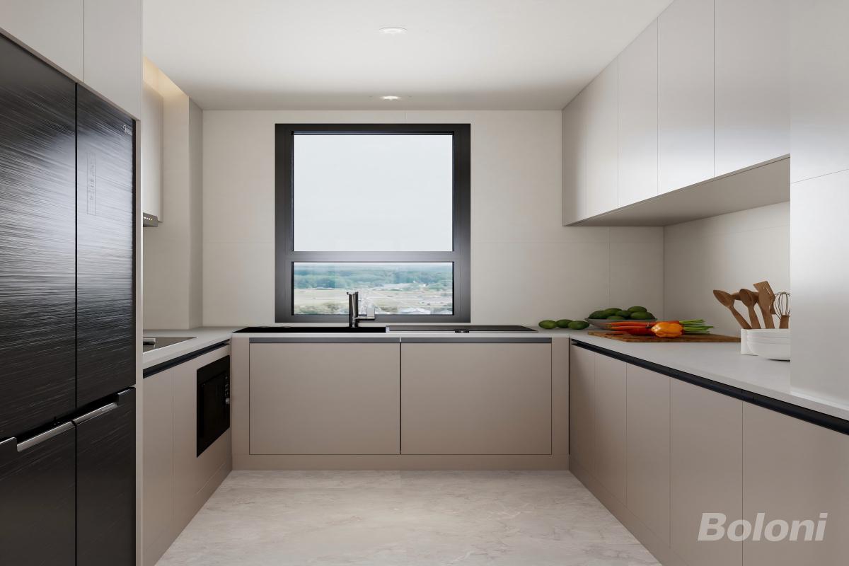 厨房的设计是将20世纪中期经典元素与现代功能相融合,营造出复古又时尚的烹饪空间,橱柜选用实木多层板材料,搭配石英石台面,既实用又美观。