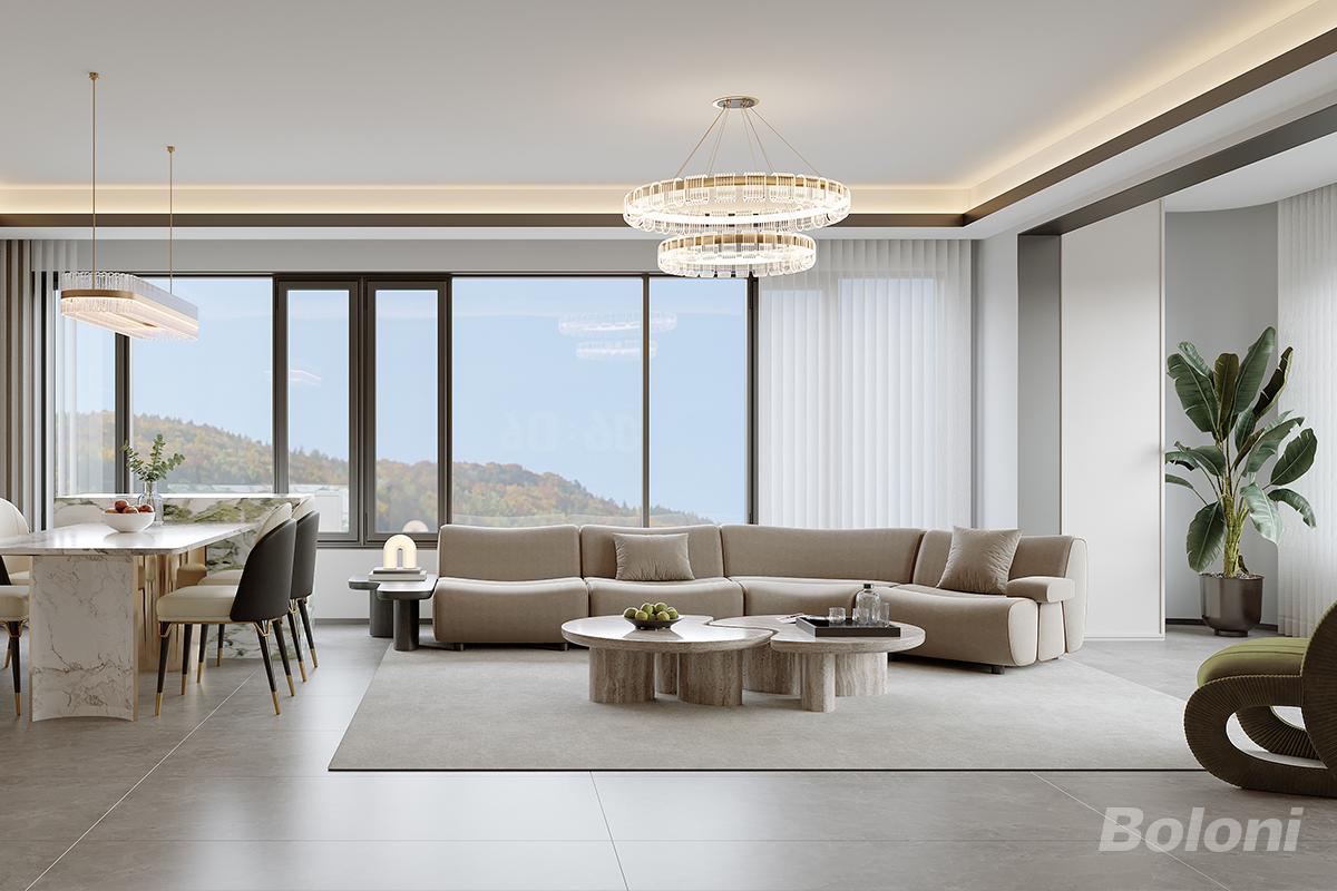 采用客厅与餐厅一体化设计,展现出简约而不失高雅的现代轻奢风格。客厅内,浅米色的大弧形沙发搭配造型独特的圆形茶几,柔和而舒适,双层水晶吊灯增添了空间的奢华感。餐厅区域,大理石餐桌与简约餐椅相得益彰,吊灯设计别具一格。大面积落地窗引入自然光线,将窗外风景尽收眼底,室内外景观完美融合。绿植的点缀为空间注入生机与活力,整体设计在简洁中彰显品质,营造出舒适且精致的居住氛围。