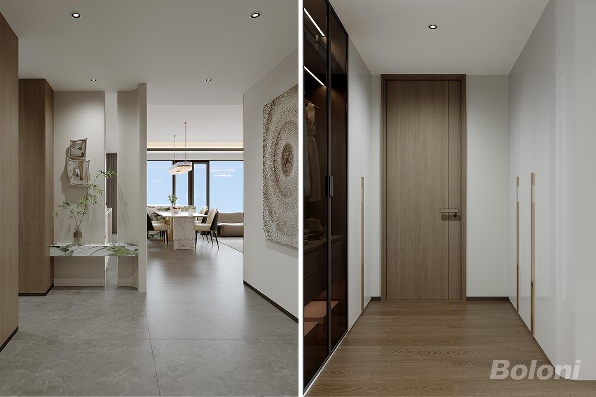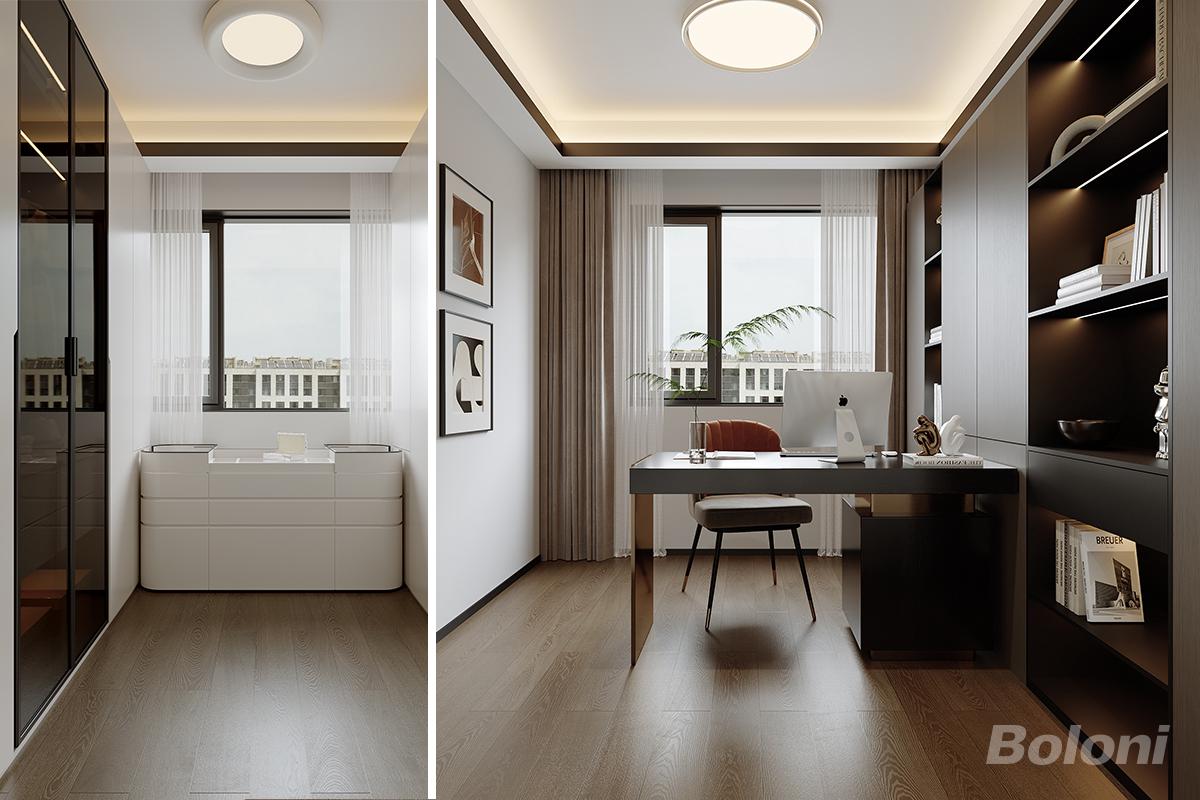 左侧为空间的门厅区域,以简约之姿迎接归人,玻璃柜门的设计时尚且实用,既拓展了视觉空间,又方便物品收纳。右侧是主卧内的衣帽间,与主卧共处一室,私密性极佳。深色的书桌搭配开放式书架,功能与美感兼具,摆件与书籍为空间注入生活气息。窗外光线透过窗帘轻柔洒入,木地板传递着温暖质感。两个空间虽不相连,却都以轻奢格调,诠释着舒适精致的居家理念。