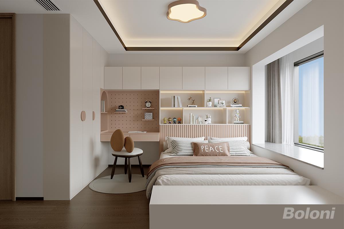 在儿童房的设计中,整体风格简约温馨。房间以柔和的米白色与浅棕色为主色调,营造出舒适宁静的氛围。定制一体化柜体兼具衣柜、书桌与收纳展示功能,洞洞板设计增添灵活性,方便孩子收纳小物件。床铺靠墙摆放,节省空间,条纹床品与抱枕带来清新感。窗边飘窗让自然光线充足进入,窗旁的圆形小凳造型独特。星星形状的吸顶灯可爱有趣,为房间增添童真,整个空间在实用与美观间达到了完美平衡。