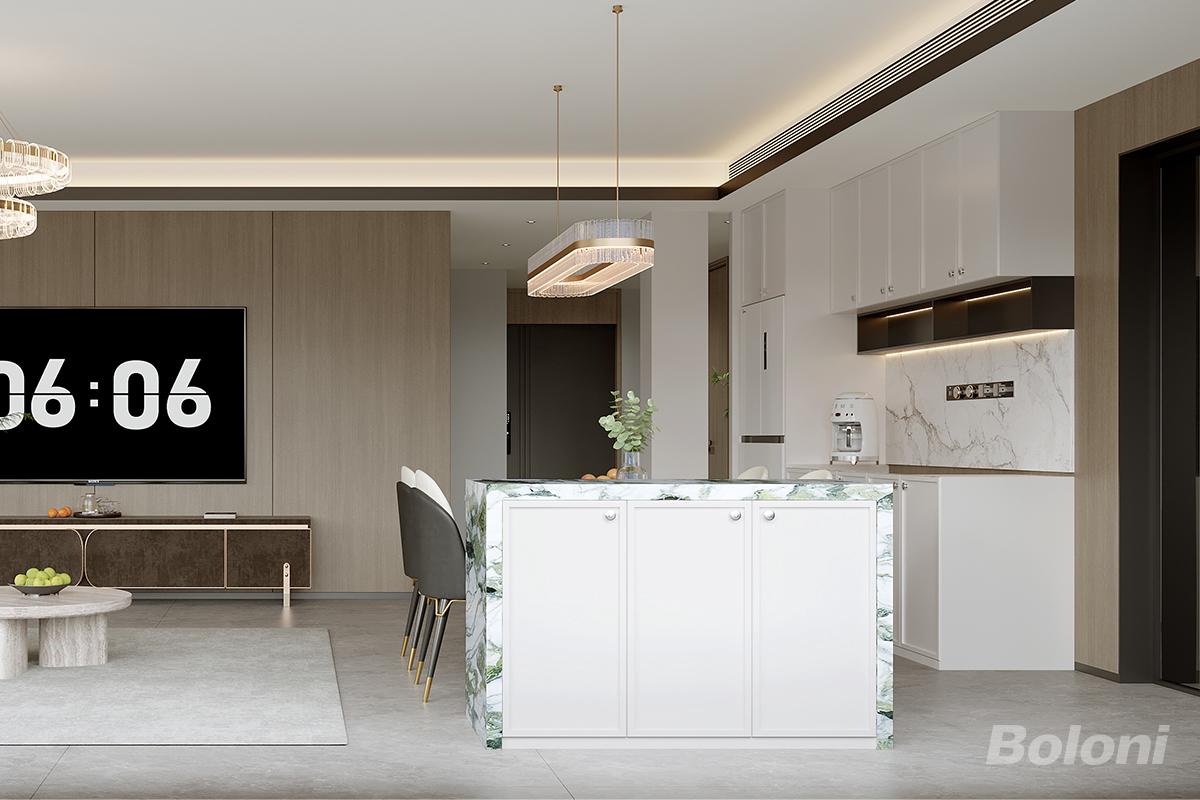 餐厅区域设计简约而时尚,巧妙融合了功能与美感。中央的大理石纹岛台成为视觉焦点,白色柜体搭配绿意纹路,清新雅致,提供额外收纳与操作空间。岛台旁的高脚椅为日常用餐或亲友小聚提供舒适座位。后方厨房区域,白色橱柜简洁大方,大理石背景墙提升整体质感。上方吊柜下方安装灯带,补充操作照明。两盏造型别致的吊灯悬于上方,营造温馨用餐氛围,整个空间色调和谐,尽显现代轻奢格调。
