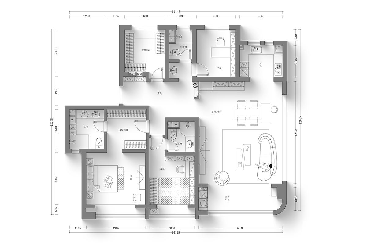 本方案为三室两厅两卫户型设计,整体风格简约实用。入口设玄关,增强收纳与过渡功能。客厅与餐厅一体化,开阔通透,搭配生活阳台,保证充足采光。厨房紧邻餐厅,方便上菜用餐。主卧配独立卫生间和衣帽间,保障私密与舒适。次卧和书房可根据需求灵活使用。双卫设计避免使用高峰冲突。各空间布局紧凑合理,动线流畅,充分利用空间,满足现代家庭生活需求,营造舒适便捷的居住体验。