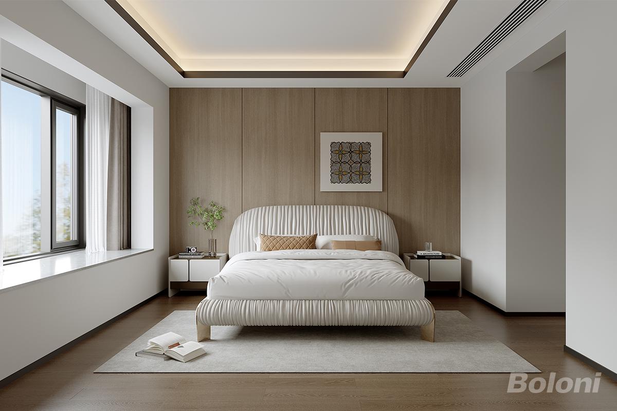 卧室以简约优雅为设计主调,营造出宁静舒适的休憩氛围。卧室中央摆放着一张造型独特的褶皱床,白色的床品干净纯粹,搭配棕色靠枕,增添温馨感。床头背景墙采用木质材料,纹理细腻,挂上一幅几何装饰画,提升空间艺术格调。两侧的白色床头柜简洁实用,绿植与小摆件的点缀带来生机与灵动。大窗户引入充足自然光,浅灰色地毯柔软舒适。整体设计在简约中追求品质,细节处彰显精致,打造出静谧而温馨的私人空间。