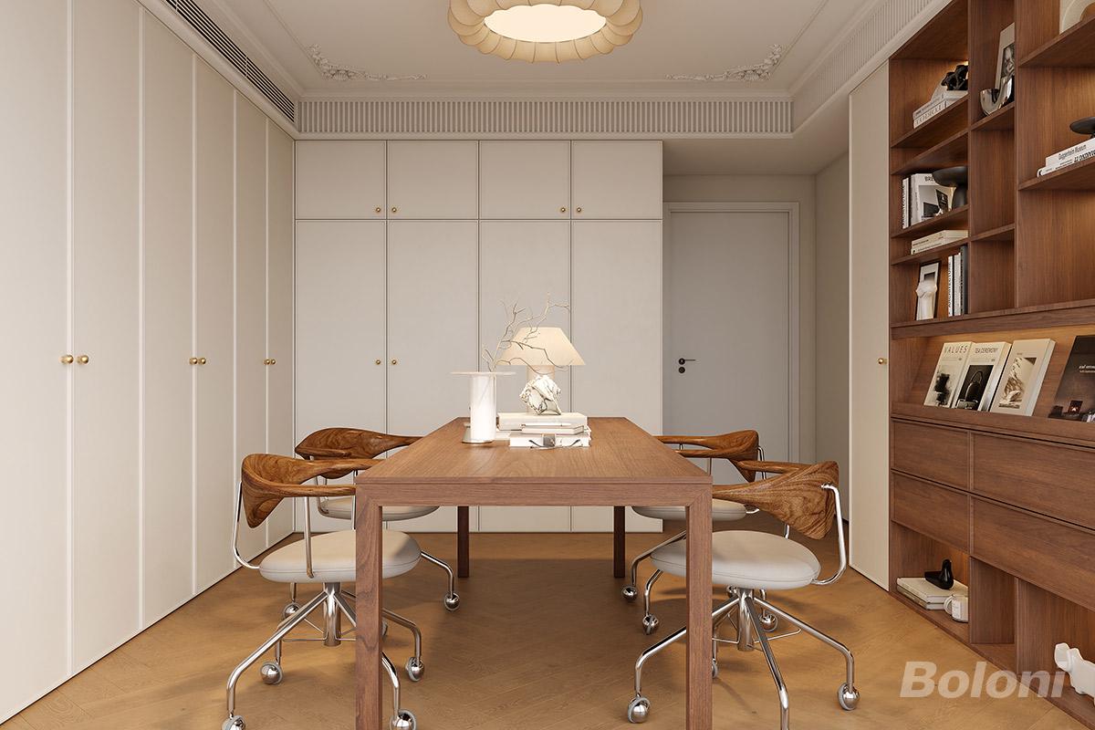 该书房以一体化收纳打造整洁布局,白柜配胡桃木柔化色调,书桌搭带轮椅兼顾实用。石膏饰与精致五金衬出质感,储物办公兼备,雅致又松弛。