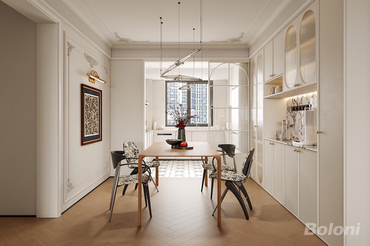 该餐区空间通透雅致,浅调基底配精致线条、人字拼地,以奶油白为底,石膏雕花、弧形元素显优雅,浪漫精致兼具质感。