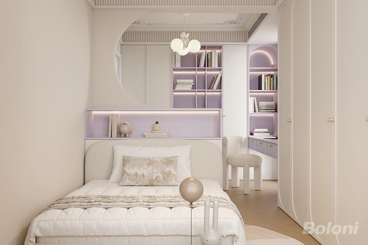 浅白叠淡紫铺陈温柔底色,弧形元素(镜面、柜门)柔化线条,嵌入式灯架 + 软装肌理(毛绒椅、床品)显精致,整体是治愈系的优雅松弛感。