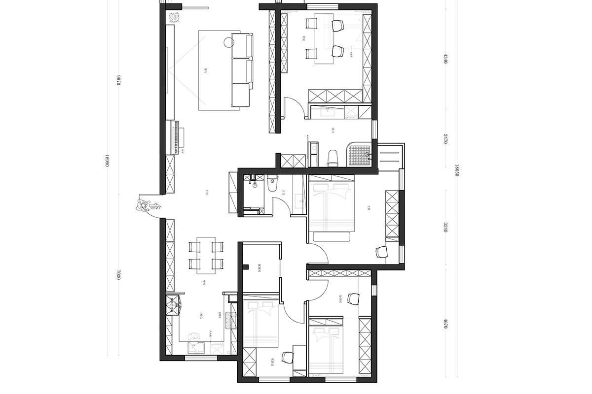 该户型为四室一厅,空间布局清晰:客餐分区联动,双卧 + 主卧适配居住,厨卫功能齐全。动线流畅,公私区域分离,兼顾实用与居住舒适度。