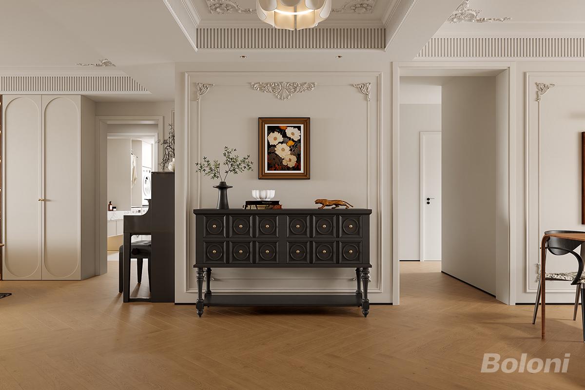 该门厅是通透过渡空间,浅暖基底衬深色复古玄关柜,石膏雕花显精致,钢琴与软装点缀,浅木地增柔和,兼具装饰与空间衔接功能,优雅实用。