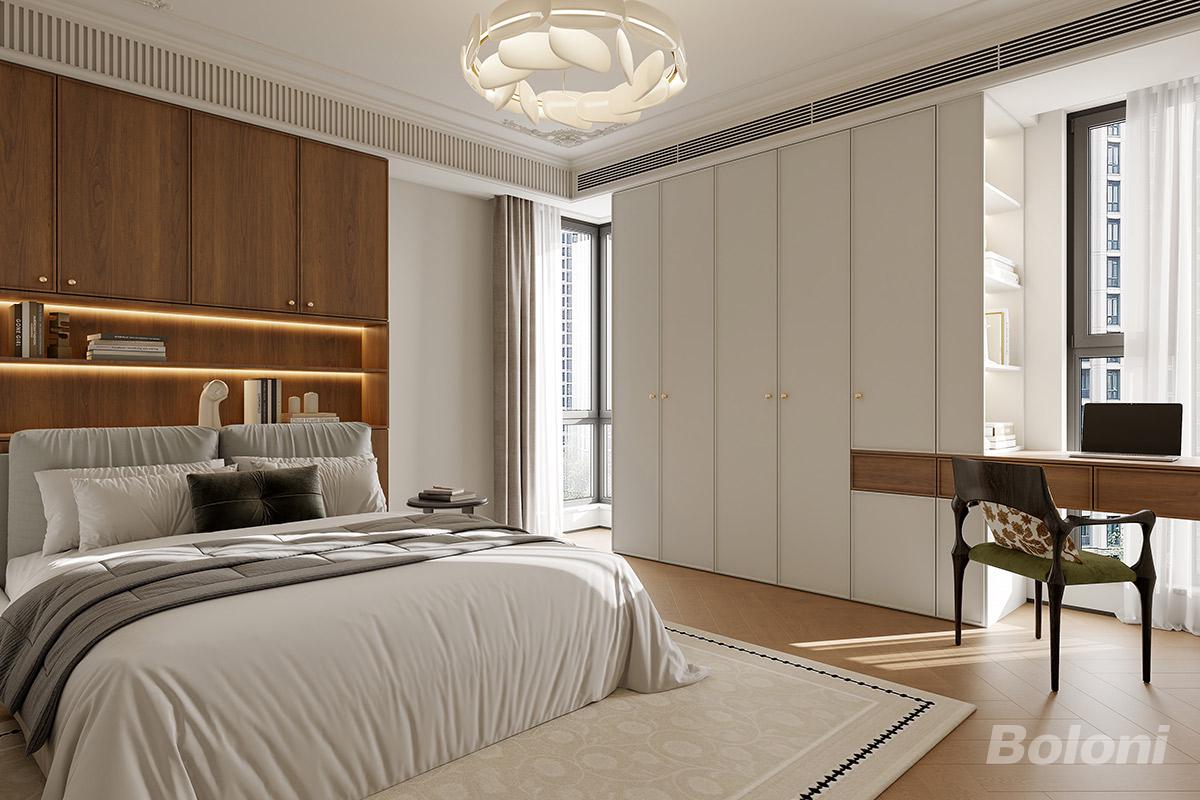 该卧室通透舒适,一体化收纳显整洁,浅调搭胡桃木暖调柔和。奶油基底衬石膏饰、精致五金,柔奢质感糅合实用布局,浪漫雅致又松弛。