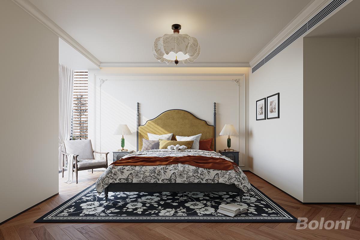法式中古风尽显优雅,绒面弧形床头搭配花卉床品,自带浪漫氛围。墙面石膏线精致细腻,复古吊灯与法式壁灯呼应,胡桃木床头柜与奶油色墙面形成质感对比,软装以柔和色系为主,整体兼具法式的精致与中古的复古,静谧又高级。