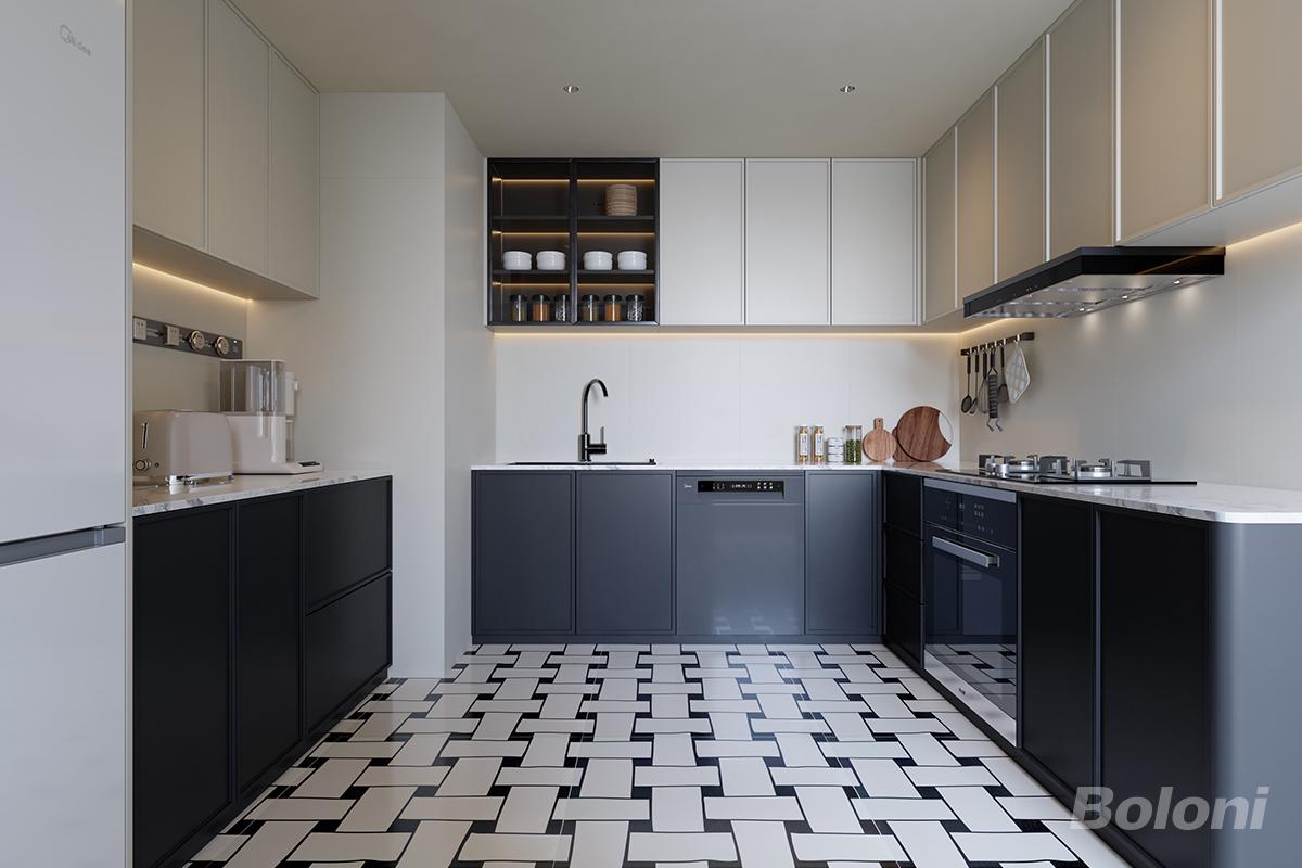 现代复古风碰撞,黑白几何地砖搭配明暗撞色柜体,线条利落干脆。定制柜体最大化利用收纳空间,简约台面搭配复古造型龙头,无过多装饰却通过色彩与材质对比显质感,既满足厨房实用需求,又融入全屋复古基调,实用与颜值兼具。